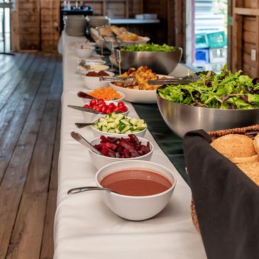 Our buffet salad bar offers a variety of fresh options, including cucumbers, peppers, cherry tomatoes, coleslaw, pineapple and more