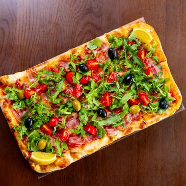 Savour our artisanal flatbread pizzas, perfect for any occasion. Each features a freshly baked, thin flatbread base topped with high-quality ingredients.